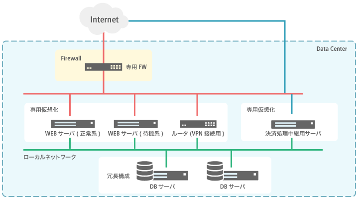 また、VPNでクライアント用の社内にあるネットワークに接続し、受注情報や出荷情報の連携を行う事や、Webサーバやデータベースは冗長構成とし24/365の安定稼働可能な構成にするなど、