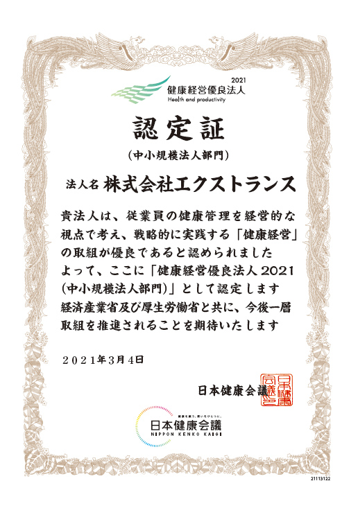 エクストランスは、2021年3月4日付で経済産業省が認定する「健康経営優良法人認定制度」より、「健康経営優良法人2021(中小規模法人部門)」に認定されました。